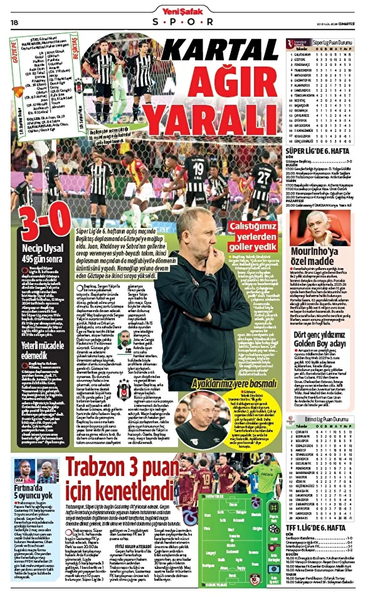 Süper Lig’de 6. haftanın açılış maçında Beşiktaş deplasmanda Göztepe’ye mağlup oldu. Juan, Rhaldney ve Sabra’nın gollerine cevap veremeyen siyah-beyazlı takım, ikinci deplasman maçından da mağlubiyetle dönmenin üzüntüsünü yaşadı. Namağlup yoluna devam eden Göztepe ise ikinci sıraya yükseldi.